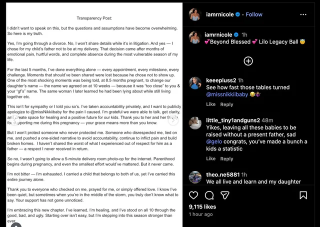 “That decision came after months of emotional pain, hurtful words and complete absence during the most vulnerable season of my life,” Nicole wrote. Gelo basically abandoned Nicole, who claims that she had to do “everything alone” in the “last five months.”