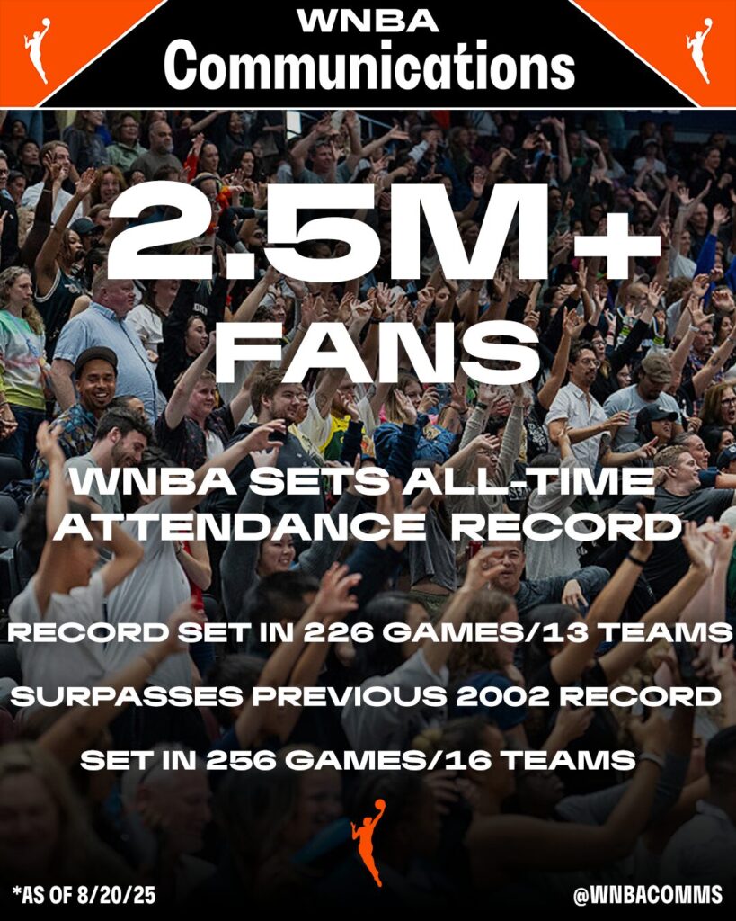 That’s not exactly true. WNBA sets an all-time attendance record with 2,501,609 fans as of 8/20/25. In 2002, the record was set with 16 teams across 256 games. This season, the WNBA broke the record with 13 teams and just 226 games.